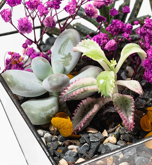 За стеклом этого флорариума рождается свой собственный живой мир. Окаменевшие серые камни и замысловатый корень создают основу ландшафта, а воздушные веточки гипсофилы и нежные лепестки гортензии добавляют лёгкости и жизни. Это уголок дикой природы, который станет умиротворяющим акцентом в любом пространстве, наполняя его теплом и естественной гармонией.
