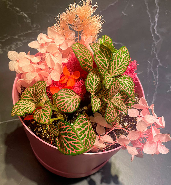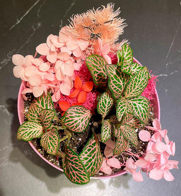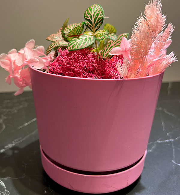 Фиттония в кашпо — идеальное растение для уюта. Её бархатные листья с ажурной сетью розовых, белых или красных прожилок выглядят невероятно декоративно. Этот маленький тропический житель любит влажный воздух, тепло и яркий рассеянный свет. Поливайте его умеренно, не допуская полного пересыхания земляного кома. Фиттония прекрасно чувствует себя в стеклянных террариумах или в группе с другими растениями, создавая эффектные композиции. Она украсит любой рабочий стол или полку, даря ощущение свежести и гармонии.